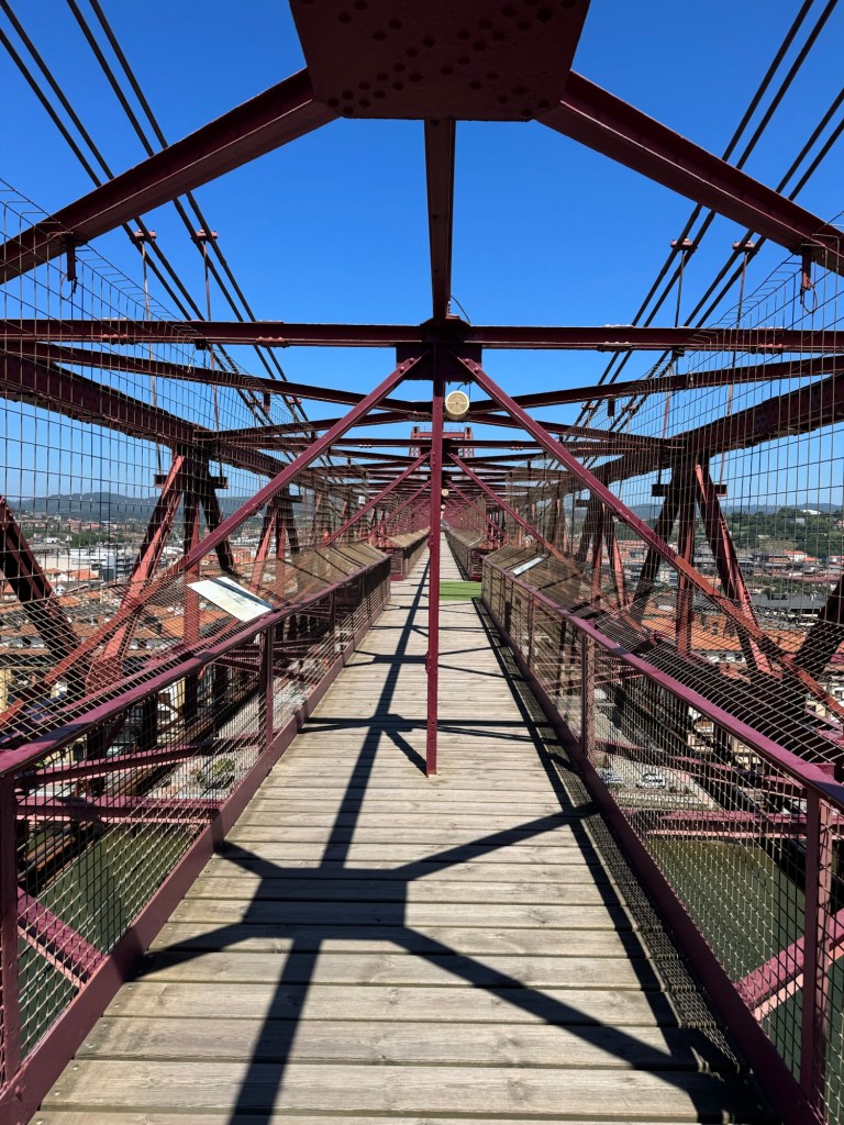 The Hanging Bridge straddles the mouth of the Ibaizabal estuary, west of Bilbao. It was designed by the Basque architect Alberto de Palacio and completed in 1893. The 45-m-high bridge with its span of 160 m, merges 19th-century ironworking traditions with the then new lightweight technology of twisted steel ropes. It was the first bridge in the world to carry people and traffic on a high suspended gondola and was used as a model for many similar bridges in Europe, Africa and America, only a few of which survive. With its innovative use of lightweight twisted steel cables, it is regarded as one of the outstanding architectural iron constructions of the Industrial Revolution. It is on the UNESCO World Heritage list.